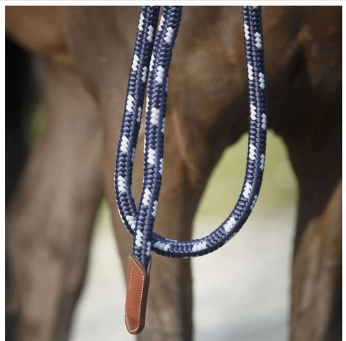 Antarès Lead Rope represents a definite step above the usual nylon lead rope for horses. This round woven nylon lead rope from Antarès has navy and a light blue/grey in a crisp pattern plus quality hardware and fine brown leather trim with cream stitching.