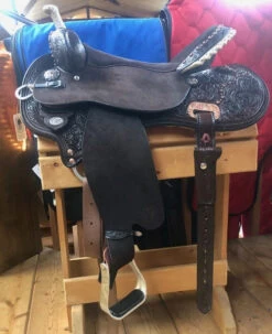 The rich deep chocolate color of the Black Powder Mounted Shooter is accented with tooling and antique copper trim.The suede seat is padded and helps keep you balanced. Mounted shooting performance features include a low swell with forward tilted horn for more room to maneuver while reaching for guns. The roughout seat jockey and fenders plus suede seat improve grip. The fenders have a stirrup leather positioner to customize fender position to suit the rider. Circle Y Black Powder Mounted Shooter has a 4.5″ cantle for added support, dropped front rigging for a close contact feel, aluminum stirrups, and a cell phone holder on the flank cinch billet. Silver laced rawhide on the cantle, rawhide braided horn, antique copper cross conchos, and spot trim in silver and antique copper add to the extra special look.