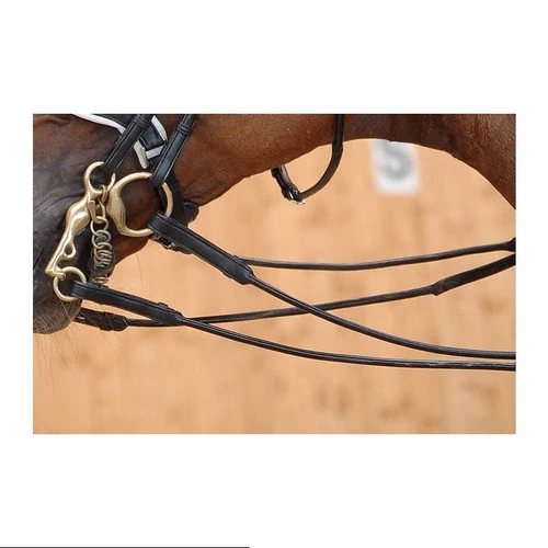 Dy’on Rolled Reins with Stops are black dressage reins in three different rein materials. All of these lovely dressage reins have fronts that are rolled leather and there are 7 leather loops. They all measure 5/8″ wide and have hook bit ends. The photo showing the reins attached to the bit on the horse show you the beautiful rolled fronts. None of the other tack shown in the photo is included with any of the reins.