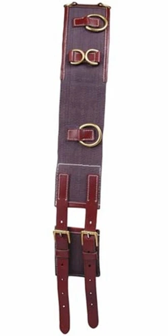 Kincade Surcingle is leather and webbing with multiple contacts for use with long lines and side reins. It offers two-buckle adjustment for bigger horses and padding to help it stay in place at the withers. Horse lunging surcingle has durable brass hardware.