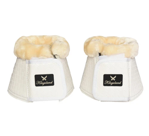 KL Dean Bell Boots from Kingsland Equestrian close in front with a secure double hook and loop tape tab. Not only does the faux fleece look nice, it protects and cushions sensitive skin from rubs and irritation. Stylish, classy, and practical Kingsland Dean Bell Boots come in a set of 2 boots in White or Black, perfect for dressage.