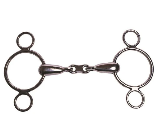 Korsteel Stainless Steel French Mouth 2 Ring Elevator Gag Bit. Double jointed snaffle bit with two ring cheeks. Available in Horse size 5, 5.5. Be sure to look at Mary’s great selection of curb chains and other bit accessories.