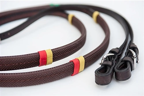 Nunn Finer Rein Markers come in a 4-color set of 16 total loops. There are 4 blue, 4 yellow, 4 green, and 4 red markers. Rein markers are a good visual and tactile aid for riders who need to work on hand placement and keeping reins even. Training rubber keepers from Nunn Finer are sold in a single pack of 16 total markers. Reins not included!